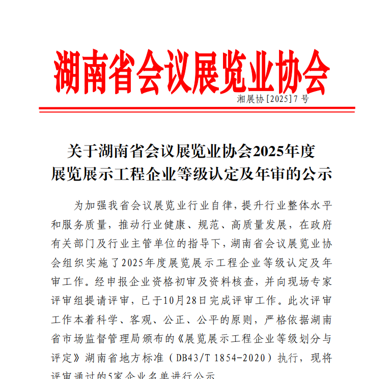 关于2025年度展览展示工程企业等级认定及年审的公示